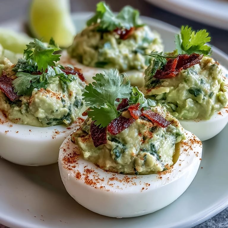 Save The cheerful sizzle of eggs boiling always reminds me of afternoons spent experimenting in the kitchen, searching for ways to liven up classic snacks. Last spring, after a farmers market trip, a surplus of avocados nudged me to combine guacamole with deviled eggs, resulting in an unexpected hit among my friends. That tang of lime, paired with creamy yolk and rich avocado, turned the usual appetizer into something playful and vibrant. I still remember how quickly those deviled eggs disappeared at our impromptu porch gathering. It's the kind of discovery that makes you appreciate how a simple twist can brighten favorite recipes.
