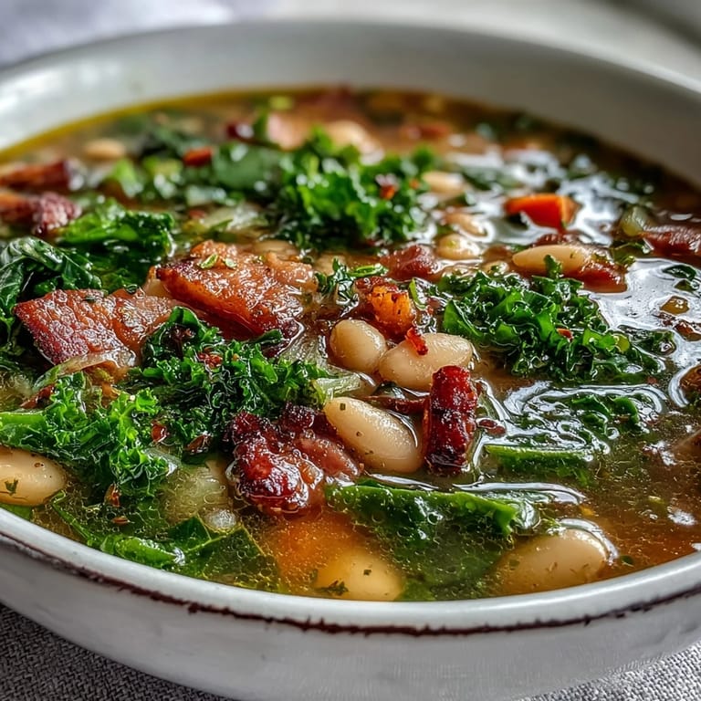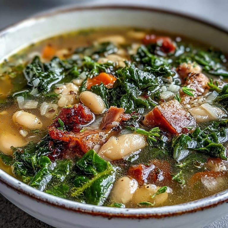 There is something timeless about a pot of soup slowly simmering on the stove. This recipe begins with the classic trio of onion, carrots, and celery softened in olive oil—a humble base that builds extraordinary depth of flavor. The addition of garlic, dried thyme, a bay leaf, and a hint of smoked paprika transforms a simple broth into something truly aromatic and complex. The cannellini beans lend a buttery creaminess that thickens the soup naturally, while the kale, added in the final minutes of cooking, brings a beautiful color and a tender bite that balances the smokiness of the ham perfectly.