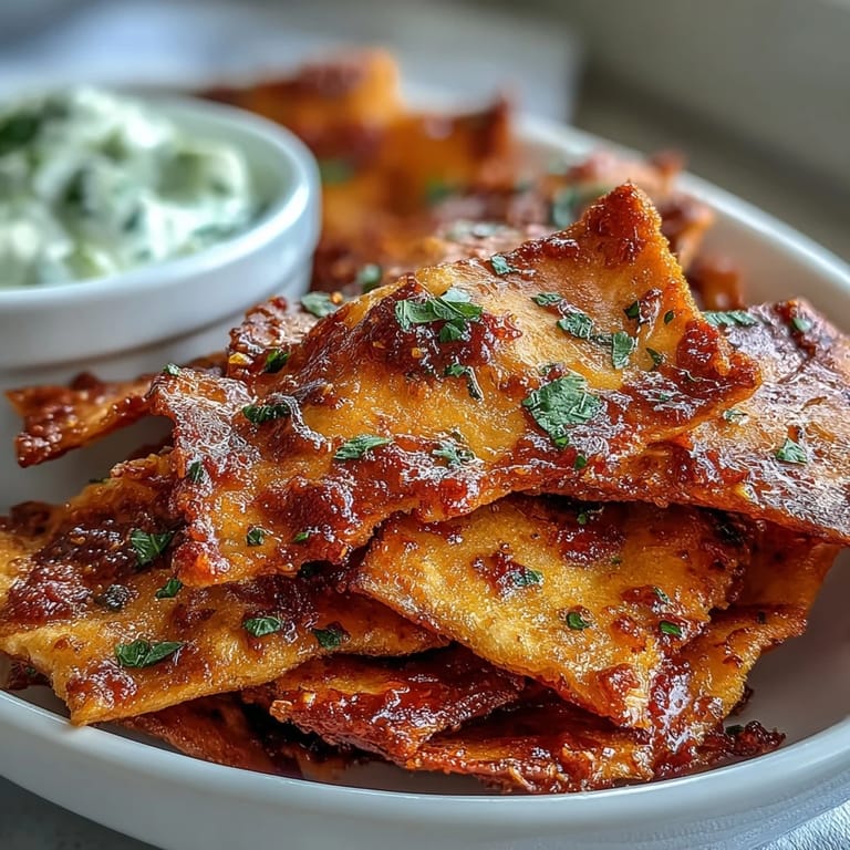 Save Elevate your snacking experience with this vibrant fusion of Spicy Chili Crisp Garlic Naan Chips and Creamy Asian Cucumber Dip. This recipe takes simple garlic naan and transforms it into golden, buttery chips with a bold kick of chili crisp heat, perfectly balanced by a refreshingly cool yogurt dip packed with fresh herbs and sesame flavor.