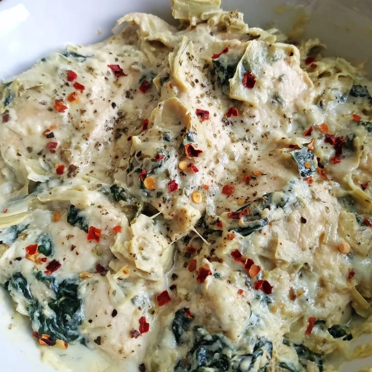 Save The smell of garlic hitting warm olive oil still pulls me back to my tiny first apartment kitchen, where I discovered that spinach and artichoke dip could actually become dinner. I was standing there in my pajamas at 7pm, realizing I had chicken thawing but zero energy for anything elaborate. That night I just mounded the dip mixture right on top of the chicken breasts and hoped for the best, and honestly? It changed how I think about weeknight cooking forever.