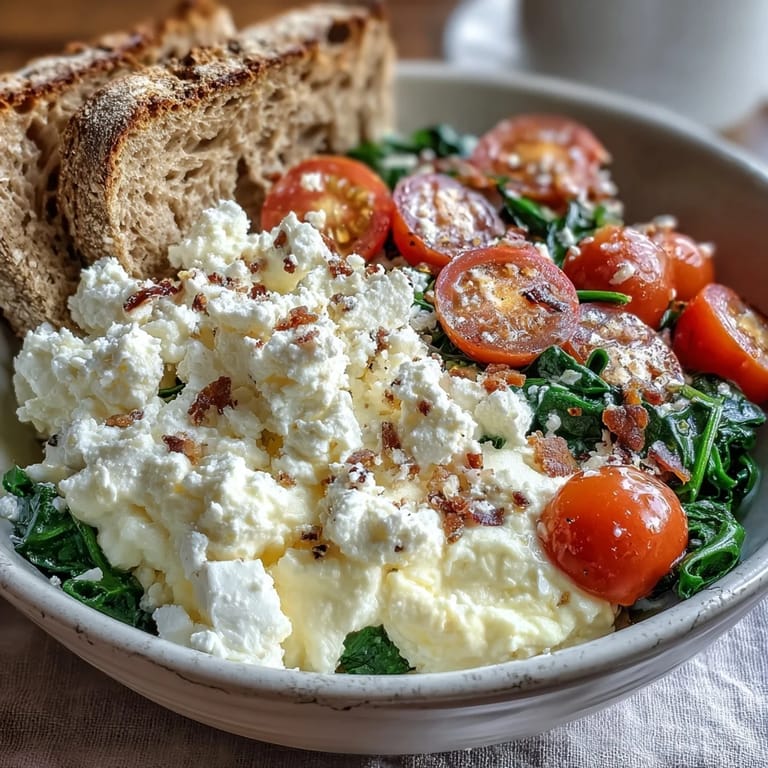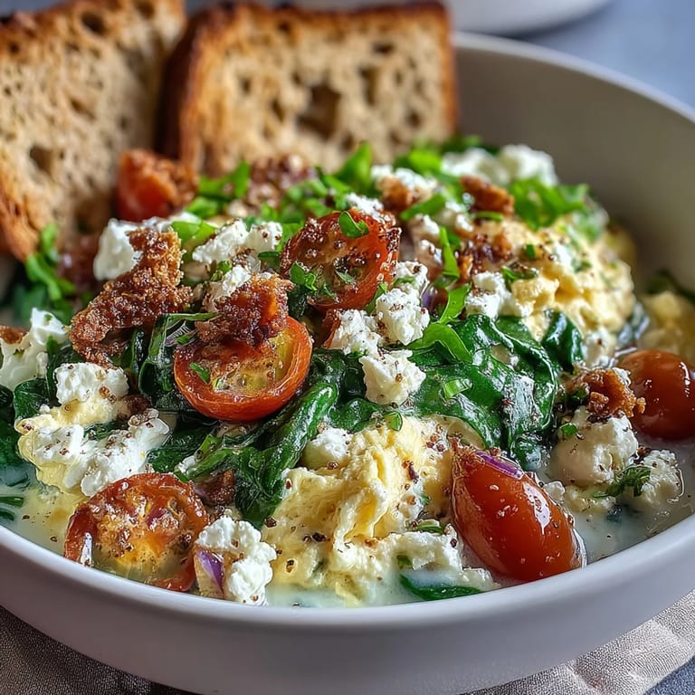 Save Start your day with a Mediterranean-inspired Spinach and Feta Breakfast Bowl. This vibrant dish features fluffy scrambled eggs paired with nutrient-dense sautéed spinach, juicy cherry tomatoes, and the salty tang of crumbled feta cheese. Served with a side of toasted whole grain bread, it is a hearty and balanced meal that comes together in just 20 minutes.