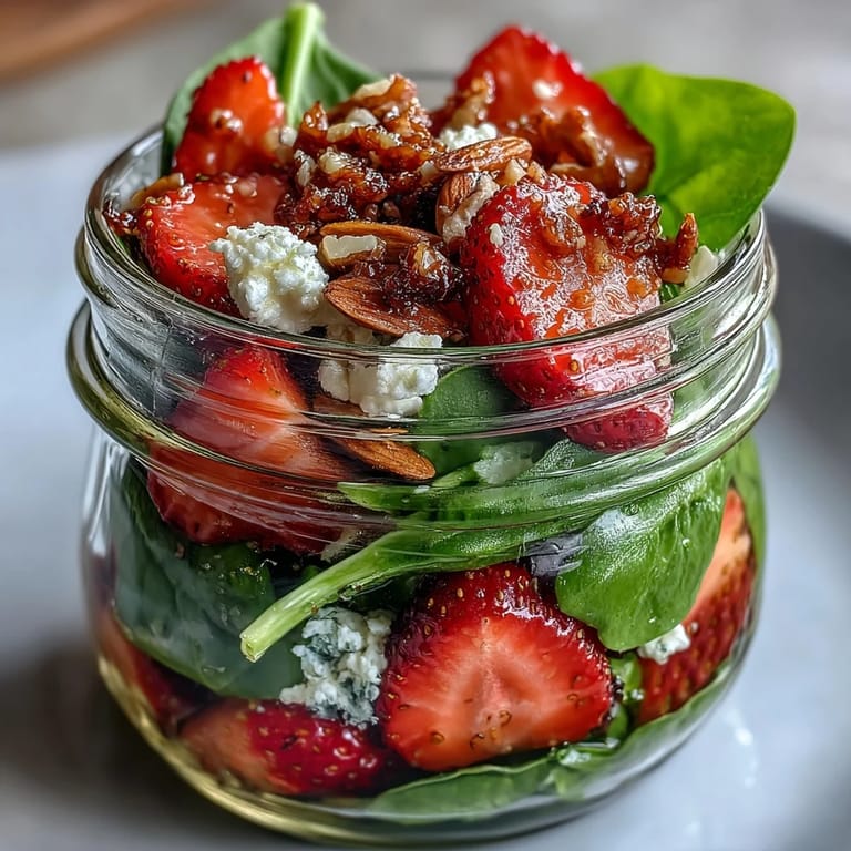 Save My coworker Sarah showed up to the office one Tuesday with four identical mason jars clinking in her lunch bag, and by the time she opened the first one, the whole break room smelled like strawberries and balsamic. She'd spent Sunday afternoon layering these salads, and I watched her shake one into a bowl at her desk—the spinach stayed somehow crisp, the almonds crackled, and I realized right then that mason jars might be the best kitchen hack I'd never thought to try. Now I make them too, usually on Sunday mornings while my coffee brews, and somehow they taste better knowing lunch is already waiting for me.