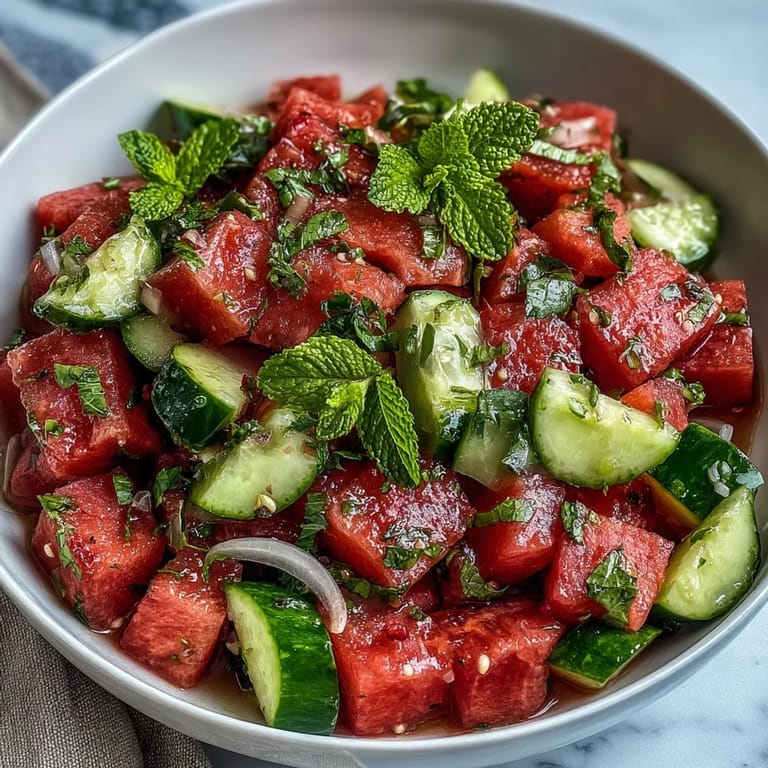 Save There's something about mid-July that makes you crave simplicity—I was standing in my kitchen watching the afternoon heat shimmer off the sidewalk when my neighbor knocked with a basket of watermelons from her garden. One was already cut open, revealing that impossible pink flesh, and I thought: why complicate this? That single moment sparked an obsession with this salad, something so effortless it barely feels like cooking, yet transforms the most ordinary summer ingredients into pure refreshment.